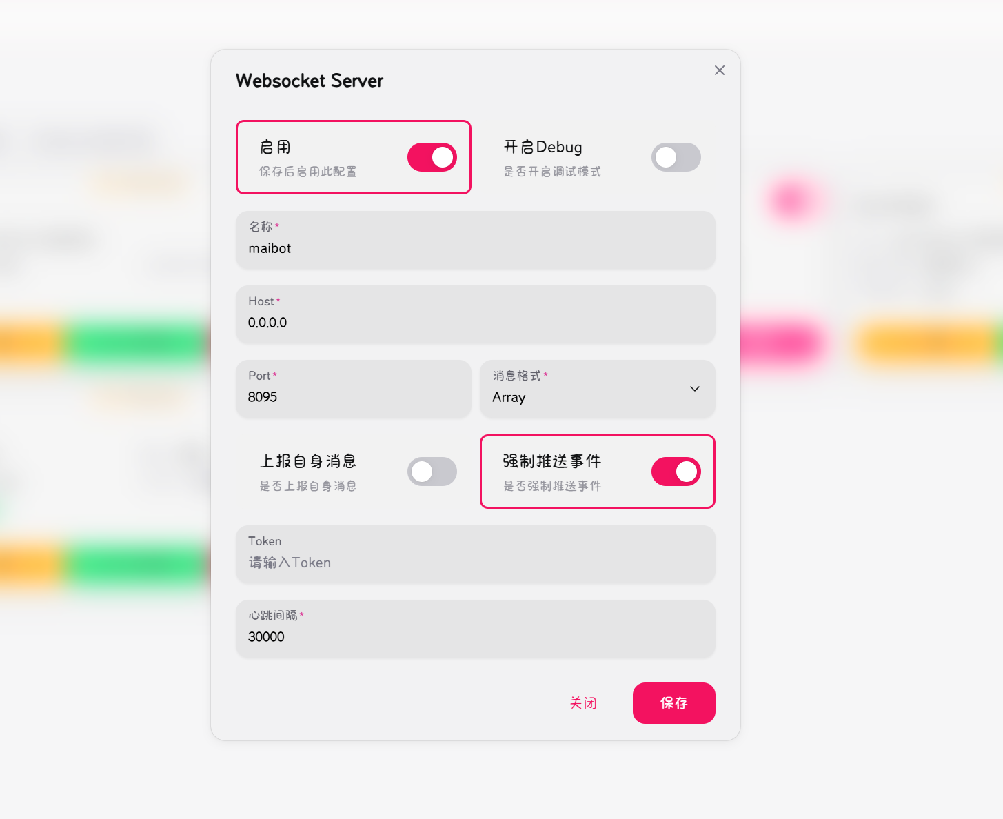 websocket服务端并设置端口为你想要的端口(这里以8095为例),Host设置为0.0.0.0 - 打开